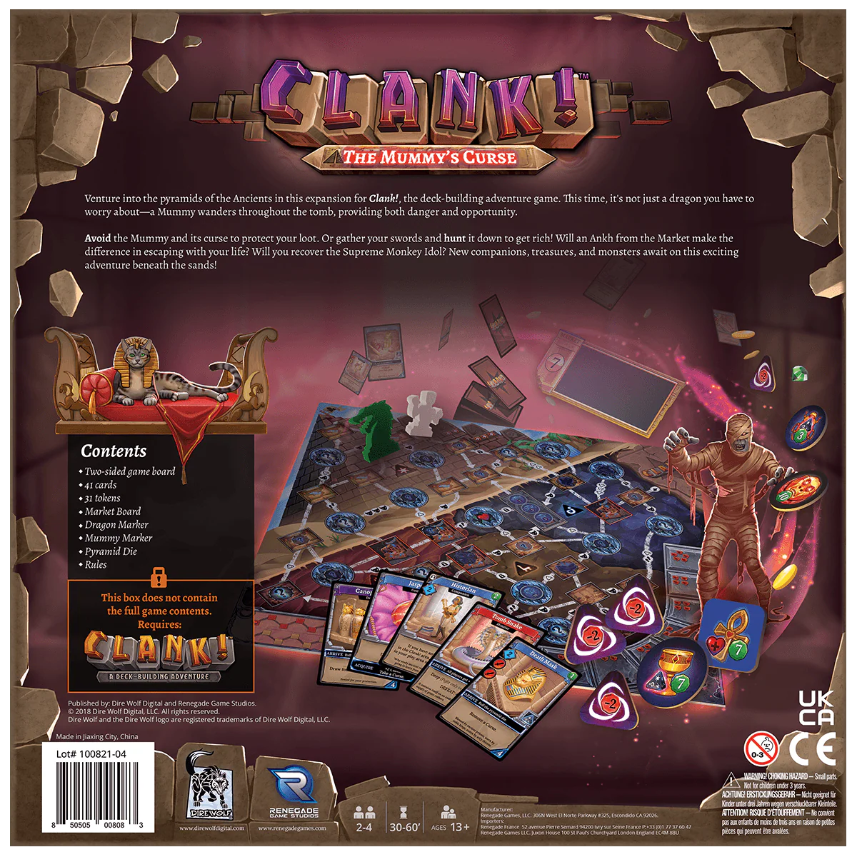 The deck-building adventure of Clank! continuesāand this time, in mysteries inspired by ancient Egypt!Ā AvoidĀ the Mummy and its Curse to protect your loot, orĀ gatherĀ you swords and hunt it down to get rich. Will an Ankh from the Market make the difference in escaping with your life? Will youĀ recoverĀ the Supreme Monkey Idol? New companions, treasures, and monsters await on this exciting adventure beneath the sands!