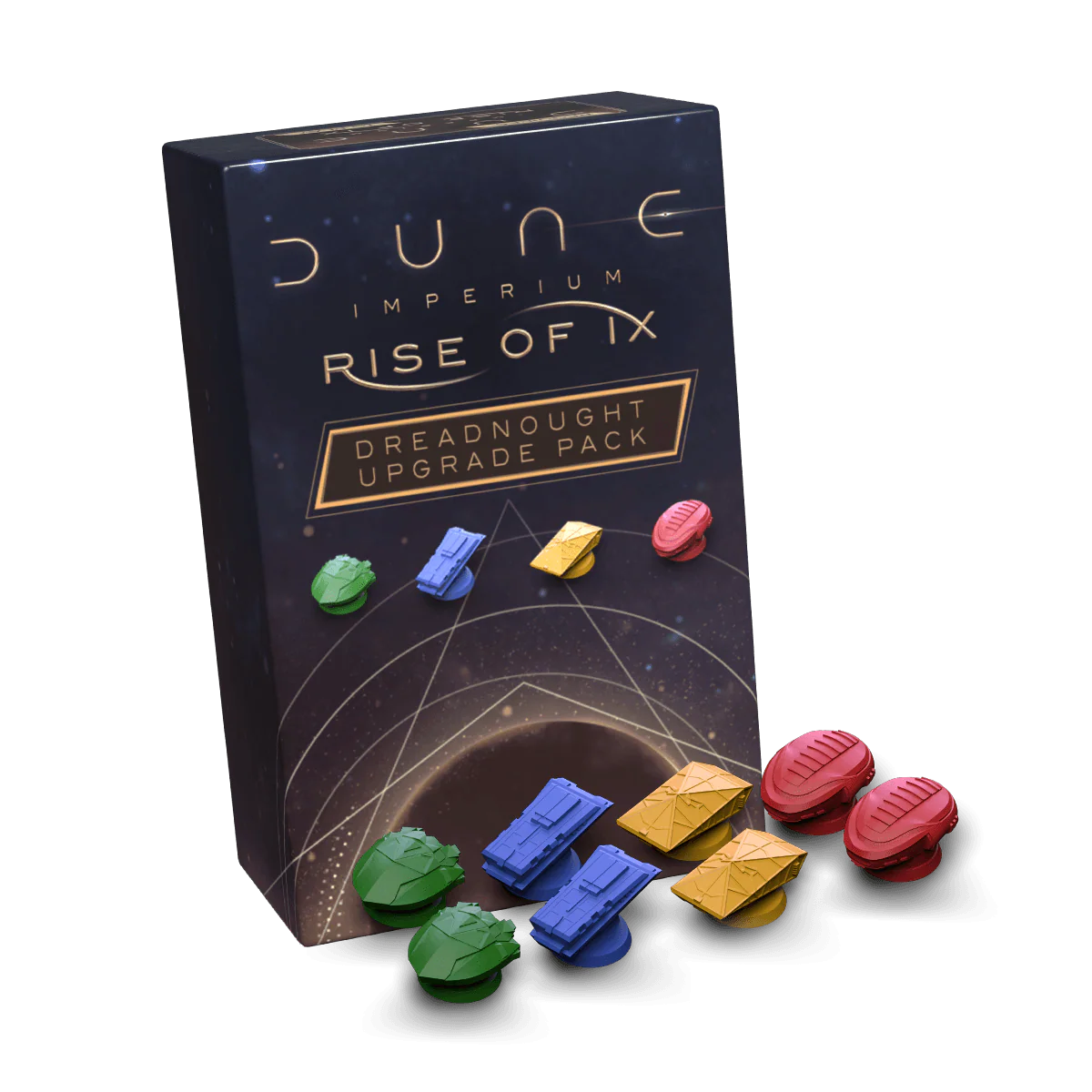 This cosmetic expansion upgrades the components of the Rise of Ix expansion for a more immersive experience. The contents include eight Dreadnought miniatures (2 in each player color) which fit in the Deluxe Upgrade Pack.